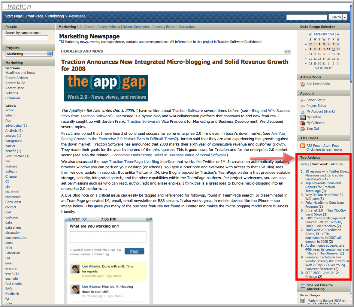 • A "Top Articles" panel on the Front Page and Project Newspages and