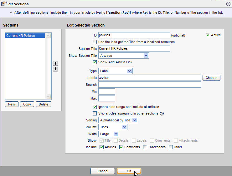 After you insert the section marker, just click Edit Sections to configure the section. You'll see a configuration window, where you will tell Traction what to include in the page section:
