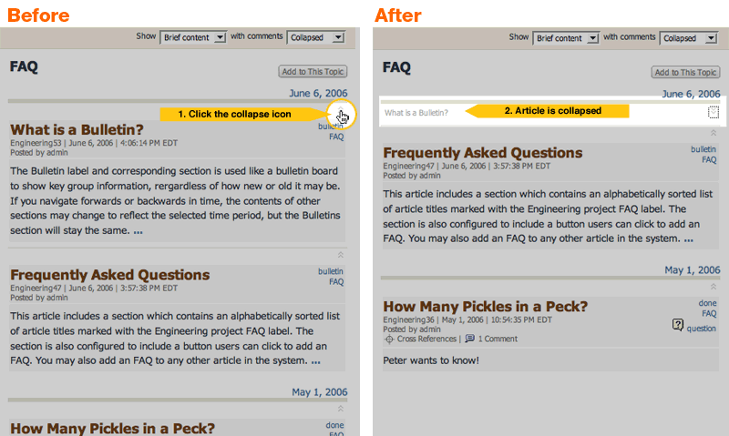 To make browsing in multi-entry views easier, you can minimize or reduce the visible content of individual articles by clicking its minimizing icon.