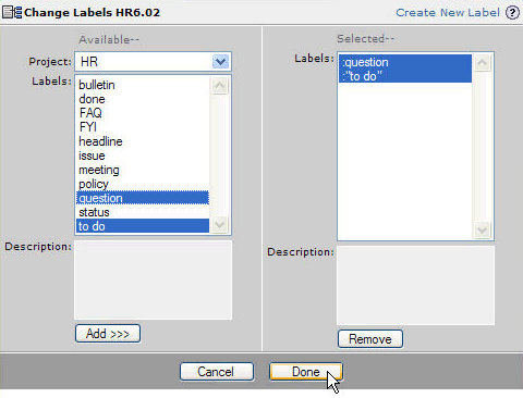 The Change Tags dialogue pops up, and the Question and To Do tags from the HR project are chosen: