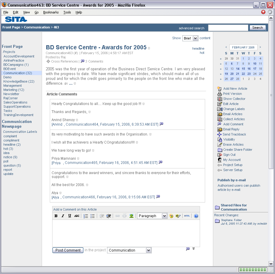 A SITA's story is published in EContent Magazine's September 2006 issue, titled A Case of Limitless Collaboration. Raj Vardahn, SITA's head of Sales and Business Development, says:
